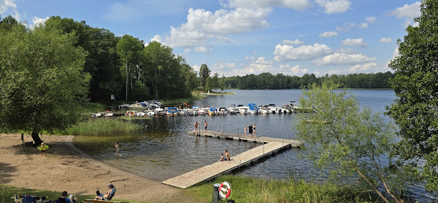 In Linkoping zitten 2 second hand shops vlakbij elkaar en wij gaan natuurlijk naar beide. Helemaal gaaf dat we in beide winkels slagen. We zijn helemaal blij met onze aankopen. Nog even naar de Lidl in Linkoping en dan gaan we echt op weg. Bij een mooi kasteel stoppen we om wat te eten. We rijden door Vimmerby, hier is het Astrid Lindgrens park, bekend van Pipi Langkous. Dat laten wij voor wat het is, maar we bezoeken hier wel een grote second hand shop. Ook hier slagen we met erg leuke spullen. Dan gaan we weer verder tot net voorbij Virserum. Hier is een kleine ski piste met de naam Misterhult. Een prima plek om vandaag te blijven. Het is inmiddels al half vijf, lang genoeg onderweg geweest. Maar omdat het ook vandaag weer een heel warme en plakkerige dag is, is het rijden met de airco aan geen straf. We lopen even naar de ski piste waar je een mooi uitzicht hebt over een meer.